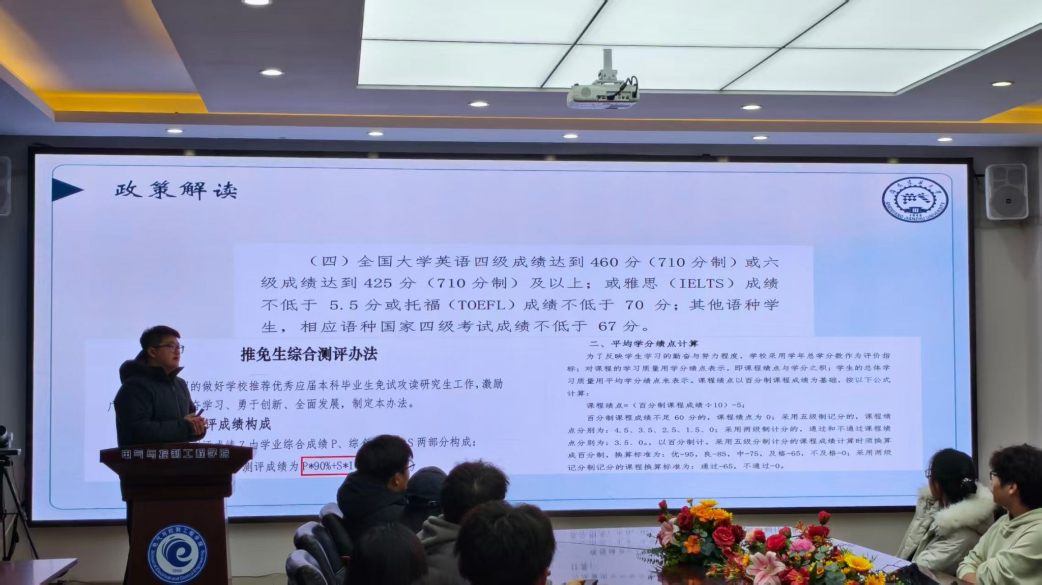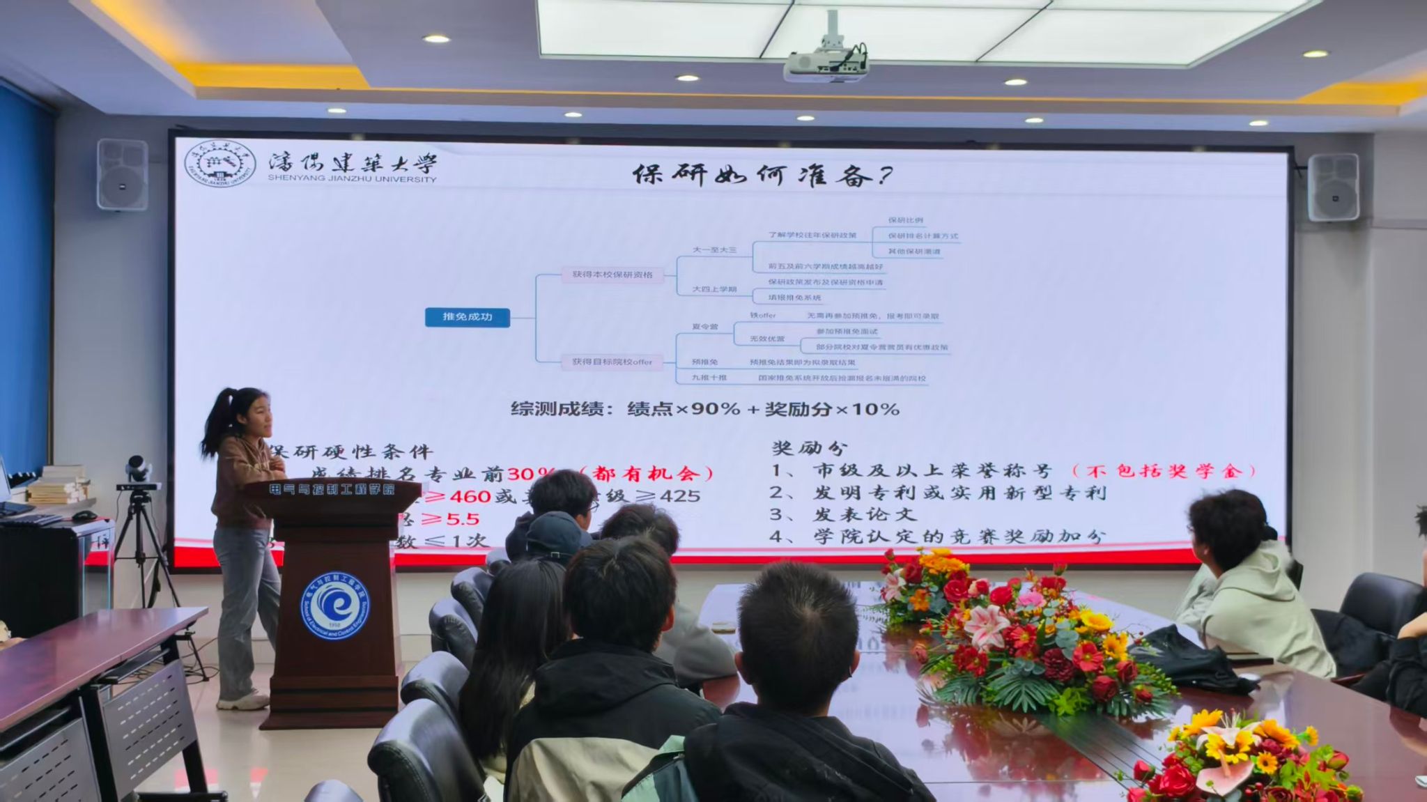 会上,保研至东北大学电气工程专业的官园博首先系统梳理了保研的整体流程与关键时间节点,详细解读了保研政策及各专业名额分配,并分享了个人在竞赛参与和时间管理方面的经验。随后,保研至西安电子科技大学新一代电子信息技术专业的郑涌泉围绕学科竞赛展开讲解,强调面试突出科研经历的重要性。他结合“西门子杯”“大学生创新创业大赛”等赛事,介绍了各类学科竞赛的特点与备赛要点,并推荐了有助于参加竞赛的信息渠道与实用平台。保研至苏州大学控制工程专业的张也则聚焦课内学习与预推免阶段,分享了自己如何在大学三年保持优异成绩、稳居专业前列,并就预推免中常见问题及应对策略进行了深入剖析。